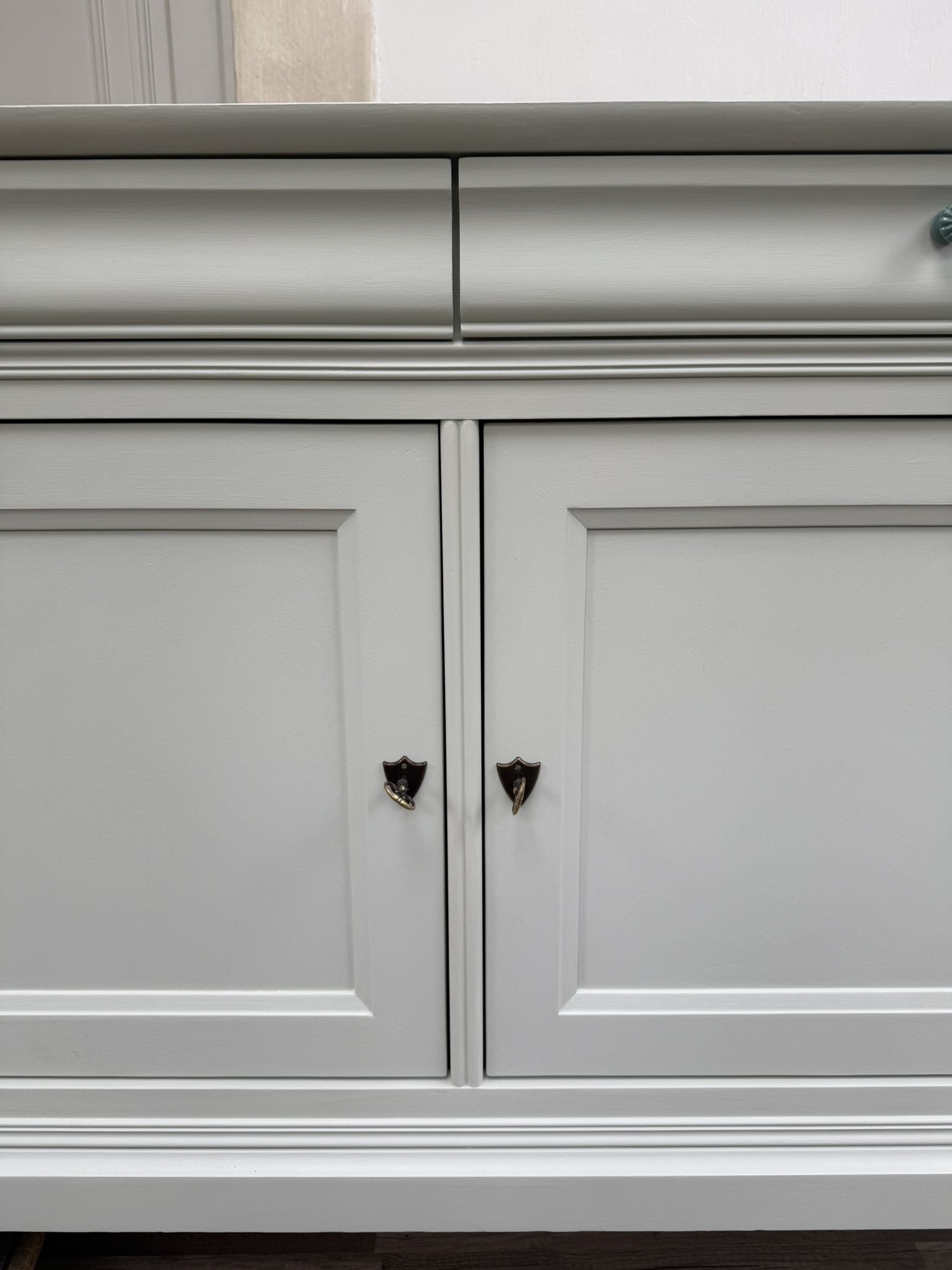 Relooking à la peinture acrylique Farrow and Ball pour ce buffet de style Louis Philippe en merisier vernis. Retrait de la partie haute pour ne conserver que l’enfilade basse. Décapage et ponçage puis mise en peinture dans les tons vert de gris très pâle. Un meuble plus clair et plus moderne adapté, désormais, à son intérieur.