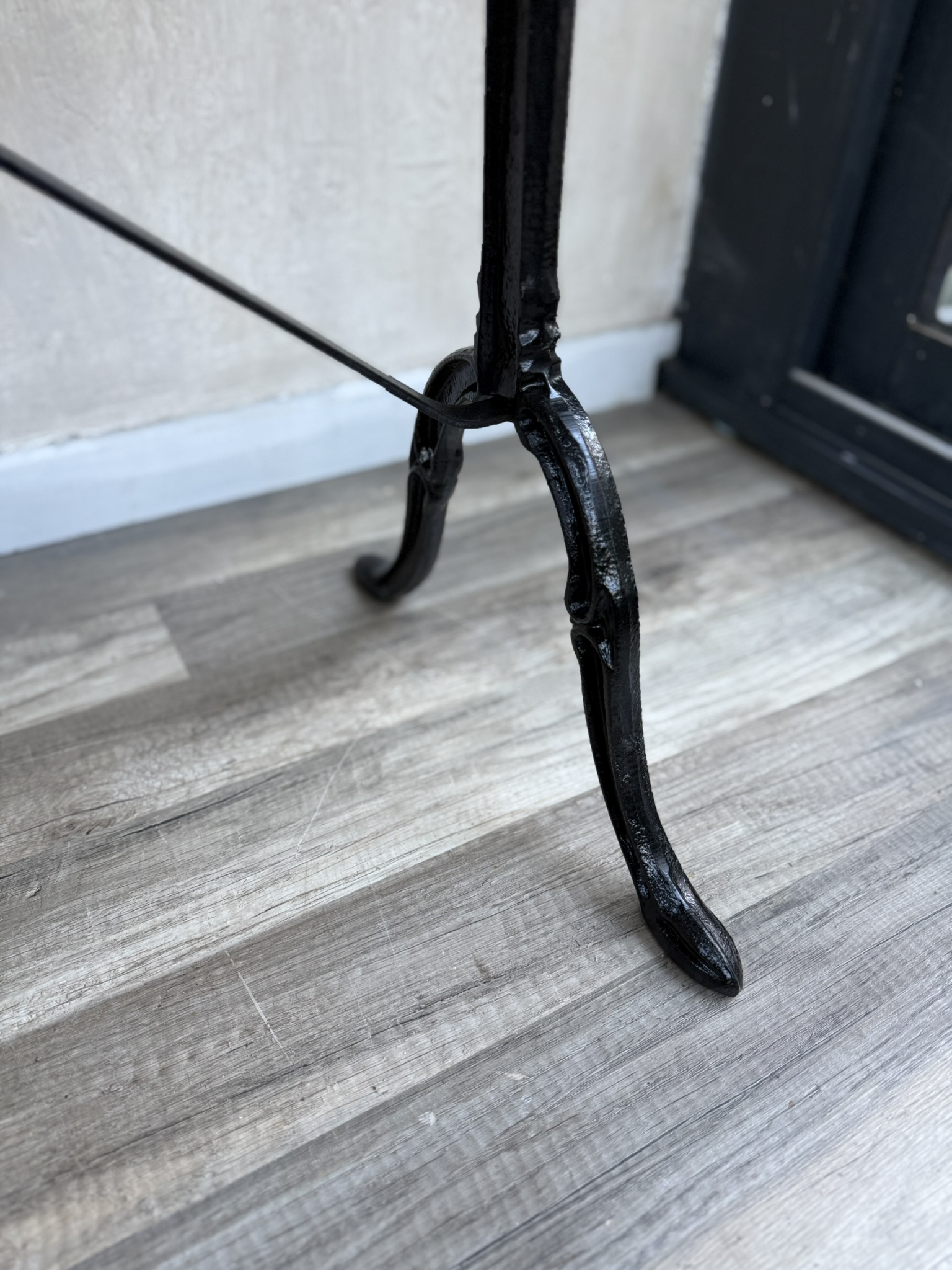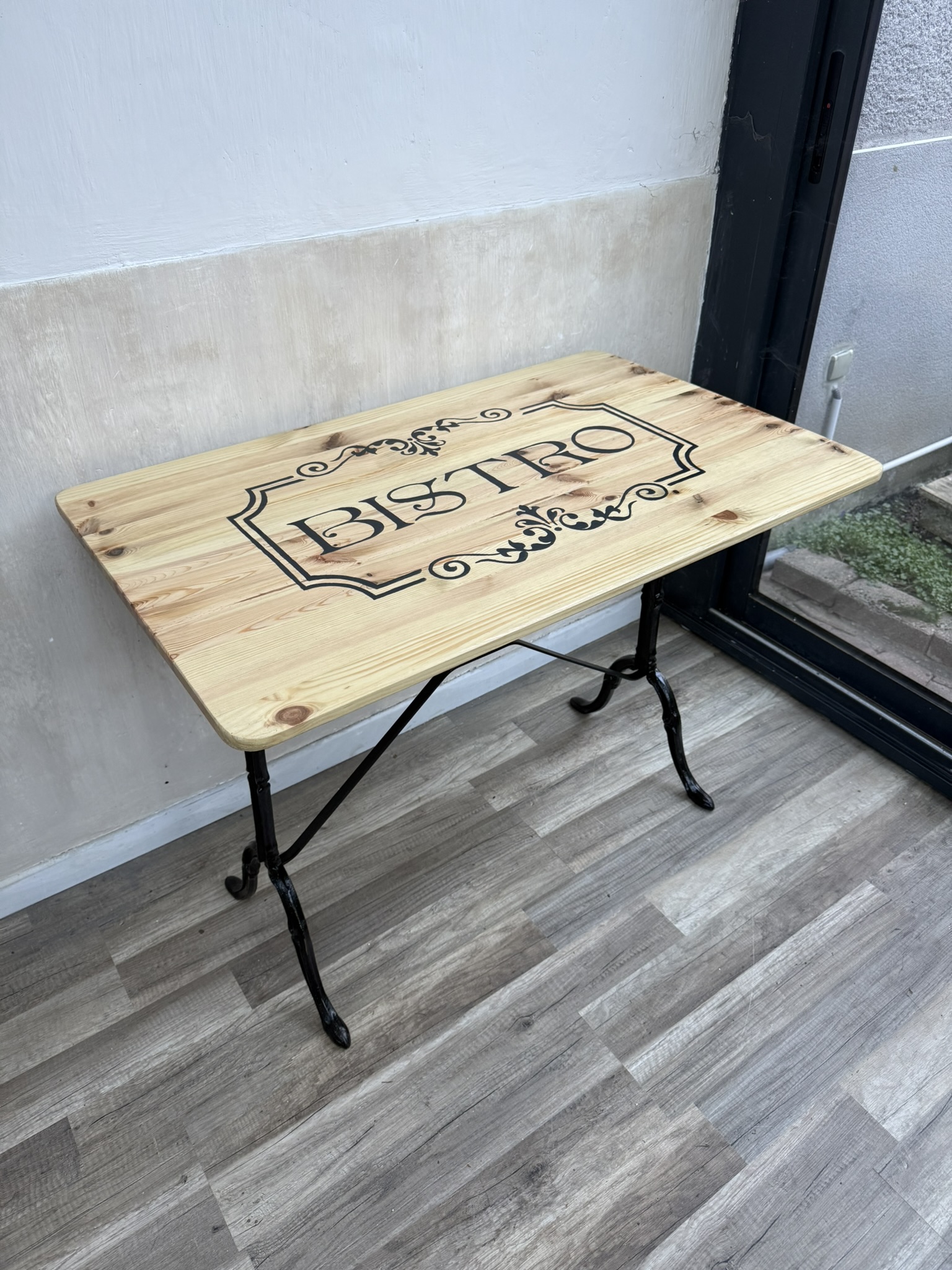 Création d’un plateau bois pour réhabiliter ce  piètement en fonte de style bistrot. Motif peint sur le plateau pour accentuer le style « Bistrot XIX° siècle ». Peinture acrylique pour le motif et vitrificateur pour meubles extérieurs sur le plateau.  Peinture antirouille pour rénover et protéger le pied de table.